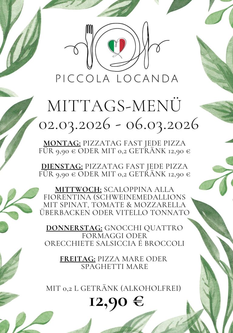 Von Montag bis Freitag haben wir in der Zeit von 11:30 bis 14:30 abwechslungsreiche Mittagsmenüs für 12,90 € inkl. einem 0,2 l alkoholfreiem Getränk.