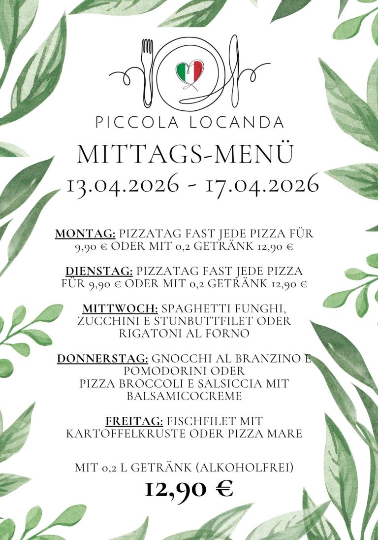 Von Montag bis Freitag haben wir in der Zeit von 11:30 bis 14:30 abwechslungsreiche Mittagsmenüs für 12,90 € inkl. einem 0,2 l alkoholfreiem Getränk.